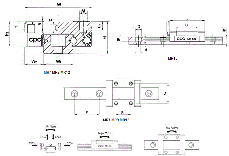 H | W2 | W1 | H1 | P | D×d×g1 | W | L | L1 | P1 | P2 | Φ | E | h2 | M×g2 | S | T | C(dyn.) | Co(stat.) | Mro | Mpo | Myo | Block g | Rail g/m | |